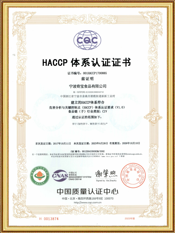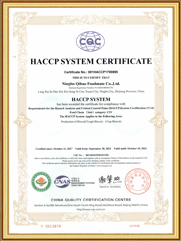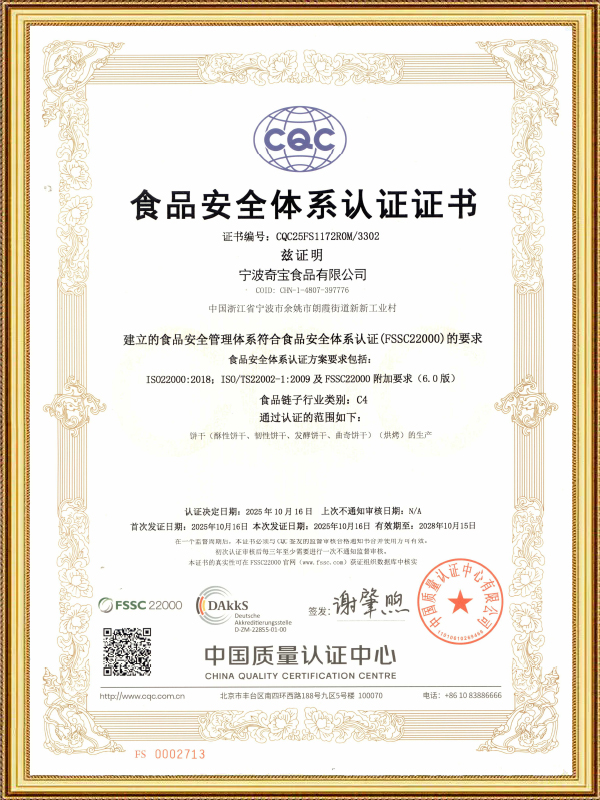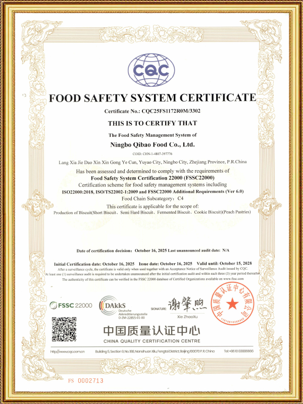 Ningbo Qibao Food Co., Ltd. was founded in 2000 and covers an area of over 10000 square meters. It is located in the Xinxin Industrial Zone of Langxia Street, Yuyao City, adjacent to the Hangzhou Ningbo 329 National Highway, connected to the Hangzhou Bay Bridge and its connecting line across the enterprise. It is 70 kilometers away from Ningbo Lishuo Airport and Ningbo Port, and 100 kilometers away from Hangzhou Xiaoshan International Airport, with very convenient water, land, and air geographical advantages. The factory specializes in producing various kinds of biscuits, such as Weihua biscuits, cakes, Chicken rolls, bread, French style carbon Shaobing (Baked cake in griddle), etc. The products are mainly sold throughout the country; The enterprise currently has 5 professional and technical personnel, equipped with 4 biscuit production lines, and a laboratory for monitoring food hygiene quality, effectively ensuring the hygiene quality of instruments. The annual sales of biscuits reach over 10000 tons.